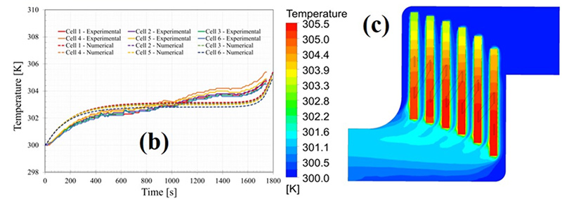 Achieving temperature uniformity in each battery cell is important as well as minimizing the temperature difference between each cell. Maintaining a constant temperature increases the lifetime of the entire battery pack, ensuring a homogeneous cell ageing process. For instance, Figure 4 below shows a battery pack module developed by the Izmir Institute of Technology, with uniform temperature distribution on battery cells and almost no temperature difference between cells (maximum 0.8°C).